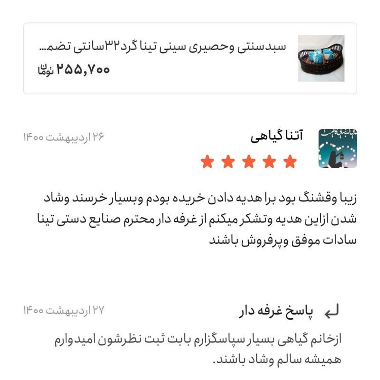 سینی حصیری گرد 32 سانتی دارای کف تخته 6میل که باپارچه کف نانو ضداب وضدلک پوشانده شده است .قبل زدن کف وزیره سبد با لایه ای از عایق ضداب پوشیده شده است .استحکام و کیفیت محصول را تضمین می کنم.این سینی سنتی میتونه برای پذیرایی در محافل زینت بخش مراسم ومیهمانیهاتون باشه. باخیال راحت ازش استفاده کن. خواهشا با اب نشورش بای دستمال نمدار میتونی خشکش کنی.