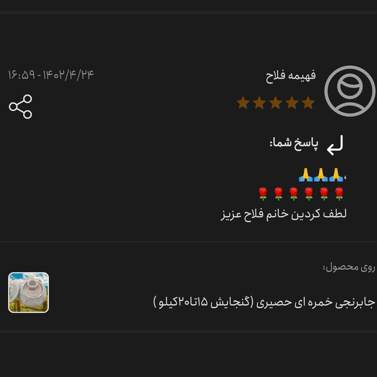 این محصول در شمال کشور از طریق تابیده شدن گیاهی خاص که بدست بانوان زحمتکش شمالی بافته می شود ویا در جنوب با برگ درخت نخل بافته میشود . ظرفیت این محصول تا 20 کیلوست ازین محصول بعنوان جای برنج (متداولتر ین استفاده)جای حبوبات و غلات و هم بعنوان نظم دهنده جای لباس رختچرک و یا در اتاق خواب جای لباس و هم جای اسباب بازی کودک کاربرد دارد بهرحال مصرف این محصول سلیقه ای است . حالا شما بفرمایید دیگه برای چه کاری میشه ازش استفاده کرد ؟؟؟ 🟢🟢هزینه ارسال با توجه به تعرفه پست محاسبه میشه و حدودا 40 تا 50 تومن ه که توسط مشتریان عزیز پرداخت میشه 🟠🟠قیمت جابرنجی ساده بدون طرح 🟣🟣سایز 35در35و قطر وسط حدودا 45 🟩🟩رو دست این جابرنجی و حبوبات نمی تونی چیز دیگه ای جایگزین کنی🟩🟩 😍😍🤩🤩 🚨🚨🚨🚨🚨🚨🚨🚨🚨🚨🚨🚨🚨🚨🚨 ❌❌پلاستیکی❌❌ و ❌❌شیشه ای❌❌ و ❌❌کیسه ای ❌❌ و❌❌ فلزی ❌❌ صددر صد قطع به یقین غلط و نادرسته 🚨🚨🚨🚨🚨🚨🚨🚨🚨🚨🚨🚨🚨 اینو تجربه ثابت کرده 🟠🟠ی سری چیزها هرگز جایگزین بهتری نداااارن چون خودش بهترین ه🟠🟠 امیدوارم بتونم خدمتی صادقانه برای شما انجام بدم