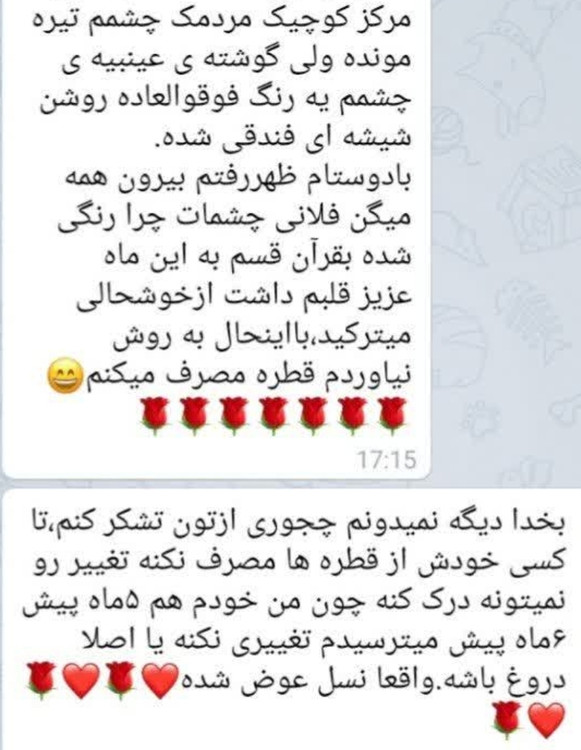 میدونم همتون تغیر رو دوست دارین استفاه از لنز تغییر مقطعی رو بهمراه داره اما معایبی هم داره که نتیجش صدمه شدید به چشم های زیبا تون میگذاره 💥💥💥برای اینکه از مزیت زود گذر لنز و معایب و عوارض لنز راحت بشین فقط یک راه وجود داره که خودش یک معجزست.💥💥💥 💯💯💯💢💚تغییررنگ چشم با قطره اورجینال و ارگانیک با تاثیرخارق العاده مادام العمر بدون کوچکترین عوارض که دارای اصالت کالاست .💯💯💯💢💚💚💚💚 ❤️❤️❤️❤️سلامتی چشهای قشنگتون واسمون مهم ه❤️❤️❤️❤️❤️ ✅️طیف های عسلی و آمبر و کهربایی و فندقی وسبز و سبز عسلی، عسلی خاکی[ثبت با رنگ سبز] ✅️ طیف های آبی یخی و آبی تیره و طوسی یخی و سبز [ثبت با رنگ ابی ] ✅️ قطره ی شتاب دهنده واسه شتاب بیشتر در نتيجه گیری [ثبت با رنگ بنفش] ✅️ اولترا لاين شامل همه ی طيف ها از تيره تا روشن [[ثبت بارنگ طلایی ]] طیف رنگ عسلی و سبز با قطره شتابدهنده [[ثبت با رنگ آجری ]] طیف رنگ آبی و طوسی با شتابدهنده [[ثبت بارنگ تیتانیوم]] اولترا با شتابدهنده [[ثبت بارنگ سفید]] نکاتی ضمن خرید شما 👇🏻 ✅تمامی تغییرات دائمی هستند ✅️ مورد استفاده: افراد بالای 15 سال به بالا مجاز به استفاده میباشند ✅میانگین اخذ نتیجه از ماه اول به تدریج شروع میشه تا 2الی 3ماه نهایتا نتیجه مشخص میشه البته یادتون باشه بستگی به شرایط بدنی داره یعنی هر فرد به فرد دیگه متفاوته بین سه تا 15 ماه متغیره ✅️روند تغییرات رنگ چشم با کاهش ملانین چشم توسط هر قطره با طيف مخصوص انجام میشود 📌تمامی قطره ها بارکد اصالت دارند کاملآ ارگانیک و اورجينال هستند ✅برند جهانی lighteyez دارای 12 تاییدیه از جمله GMP اروپا FDA امریکا میباشد و کوچک ترین عوارضی نخواهد داشت 💢💢💢✅طرز استفاده ی قطره ی چشم👇👇💢💢💢 👁👁 هفته ی اول روزانه یک قطره صبحها 👁👁 از هفته ی دوم به بعد روزانه دو قطره صبح و بعد از ظهر در هر چشم یک قطره بچکانید 👁👁حتما قطره در نوبت صبح استفاده شود 👁👁شتاب دهنده را ده دقیقه یا نهایتا یک ساعت بعد از قطره ی اصلی استفاده کنيد 👁👁 در یخچال نگهداری شود 👁👁برای جذب بهتر حتما سر خود را به سمت بالا گرفته و قطره در چشم چکانده شود و پس از اون مرتبا پلک بزنید 👁👁سپس چشم را بسته و با نوک انگشت روی پلک را به آرامی ماساژ دهید 🤩🤩🤩🤩🤩🤩🤩🤩🤩🤩🤩🤩🤩🤩🤩🤩 منظم استفاده کنيد تا شما هم به نتيجه دلخواهتون برسيد عزيزم 🙏🏼🌹قطره های تغییر رنگ چشم وروشن کننده ی چشم لایتیز، مجموعه ای از محصولات جدید انقلابی هستند که رنگ چشم شما رو تغییر میدهند.✳️ اگر طبق دستورات منظم استفاده کنید، قطره های تغییر رنگ چشم، به طور طبیعی رنگ چشم ها رو روشن میکند ورنگچشم را در عرض سه تا پانزده ماه تغییر میدهند (بستگی به نوع محصول و تیرگی چشم دارد) والبته در اکثر موارد ماه اول رنگ چشم روشنتر میشه به تدریج به رنگ دلخواه میرسید🤩 این قطره ها با شکستن و از بین بردن ملانین چشم و سایر رنگدانه ها و همچنین مهار تولید وعملکرد تیروزیناز(که باعث تیره شدن چشم ها میشود ) عمل می کنند.✳️ همانطور که رنگدانه به تدریج حذف میشود، رنگ چشم روشن و تغییر رنگ میدهد.💠 عسلی، کهربایی، فندقی، سبز، سبز عسلی، عسلی خاکی، ابی و خاکستری در نتیجه رنگ چشم های شما به طور دائم شروع به تغییرات رنگ دلخواه میکند. زمان اماده سازی حدودا هشت روز 💥💥💥💥💥💥💥💥💥💥💥💥💥💥💥💥💥💥توجه : ارسال بسته بصورت پسکرایه که درب منزل پرداخت می کنید حدودا85ت ارسال باپست هزینه حدودا40ت که قبل ارسال پرداخت می کنید 💥💥💥💥💥💥💥💥💥💥💥💥💥💥💥💥💥💥 برای اثربخشی قطره ها ی تغییر دهنده حتما همراه با شتابدهنده مصرف شود چنانچه تنها قطره تغییر رو تهیه کنید حدودا تغییر 50 تا 60 درصدی رو انتظار داشته باشید و اونهم در زمانی طولانی تر 💥💥💥💥💥💥💥💥💥💥💥💥💥💥💥💥💥💥 😍😍😍💫💫💝💝💝💝💝💝💝💝💝💝💫💫😍😍و اما هدیه ویژه ما به مشتریان عزیز تهرانی کد تخفیف 150 هزار تومنی و ارسال با پست پیشتاز و هزینه 