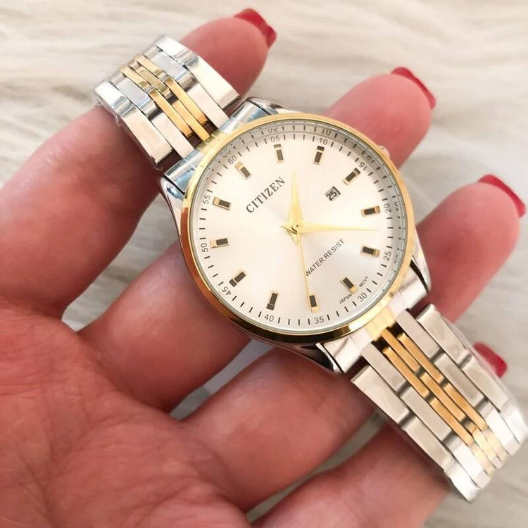 ساعت ستیزن زنانه با مختصات ظاهری صفحه گرد به قطر 28سانت زمینه سفیدوبند استیل دورنگ می باشد .